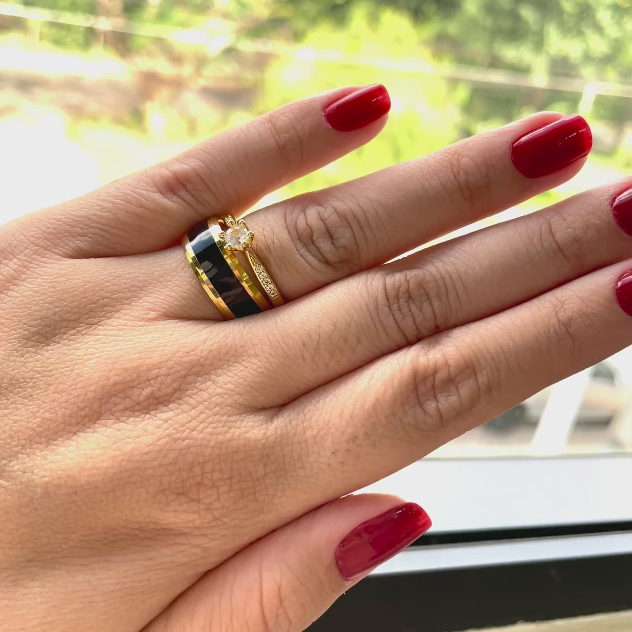 Combo Alianca Tungstenio E Friso Preto 6Mm Solitario Cravejado Banhada A Ouro 2 Anos De Garantia